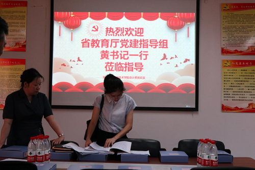 校党委副书记吴有恩对学校的党建工作、思想政治教育、依法办学工作等情况向指导检查组作了介绍。检查组对我校党支部标准化规范化建设工作给予了充分肯定,并就相关问题进行了深入交流,对我校进一步做好党支部标准化规范化建设提出了意见和建议。且对会计系党总支的特色项目“八一工程”和商务系党总支的“浙商文化”特色品牌,倡导诚实守信、勇于创新精神,实现“三心”(学生安心、家长放心、企业倾心)的品牌建设和特色做法表示了极大的赞许,并前往会计系和商务系的党员之家,对会计系党总支、商务系党总支、管理系教师党支部、建筑工程系学生党支部、应用语言系教师党支部的党建材料、台账等进行了认真检查,并提出了建设性的建议。