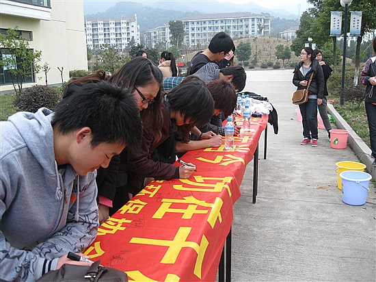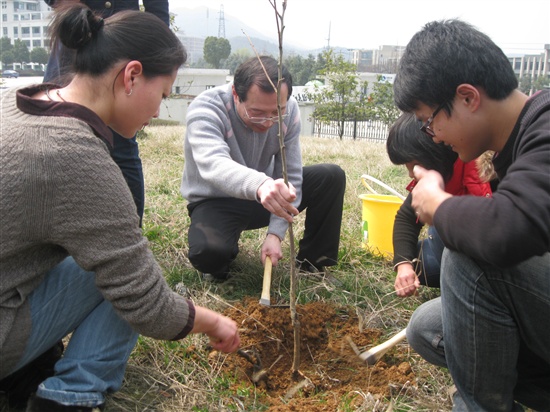 植树活动中,老师和同学们分工合作,挖坑、栽植、填土,大家都热情高昂、干劲十足,配合默契,将一棵棵充满生机和希望的树苗植入校园。经过大家的共同努力,共栽下20余棵树木。活动过程中,学院领导还与学生们亲切交谈,希望全体学生能进一步树立保护环境的意识,强化保护环境的责任。最后,大家纷纷在“植树造林 利在当代 功在千秋”的横幅上签名以表达对此次活动的支持。