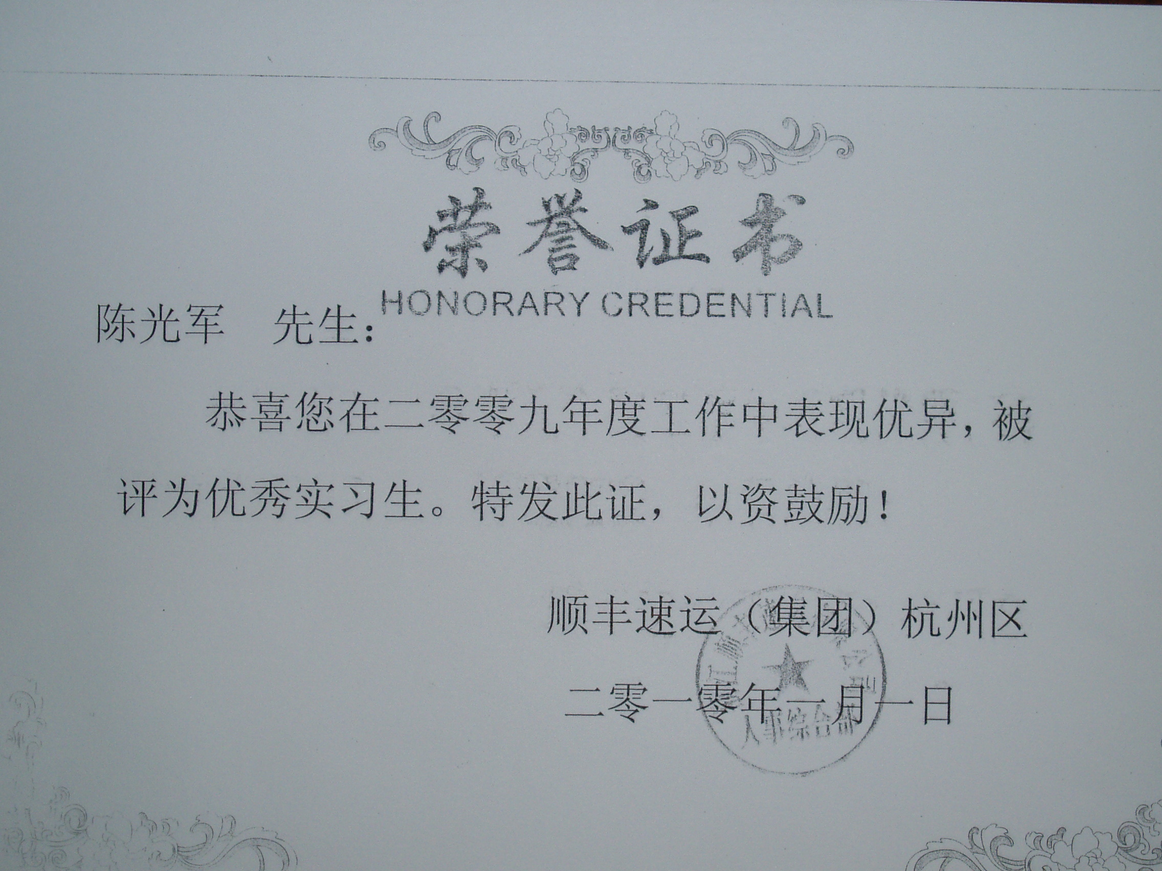 2009年是顺丰速运集团大量引进人才的一年,陈光军同学作为商务系物流管理专业09届毕业生,能在顺丰公司工作的所有毕业生中脱颖而出是有原因的。