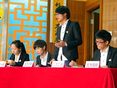 比赛分为立论、陈词和自由辩论三个环节。继精彩绝伦的自由辩论环节后,比赛进入总结陈词环节。我方四辩叶松龄同学则更以其严密精细的逻辑思维,声情并茂的言语表达引起了现场观众的强烈共鸣。